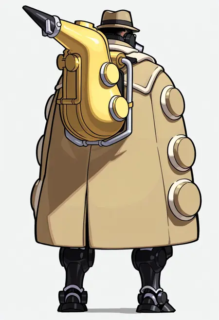 背中にサクソフォンが取り付けられている、機械式の足、機械式の足、