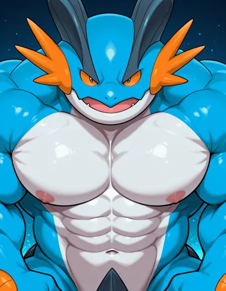 Sw4mp3rT, m3g4-forms, bulky, muscle, orange sclera, blue skin, black fins, white stomach, orange spiky cheeks, black fingers