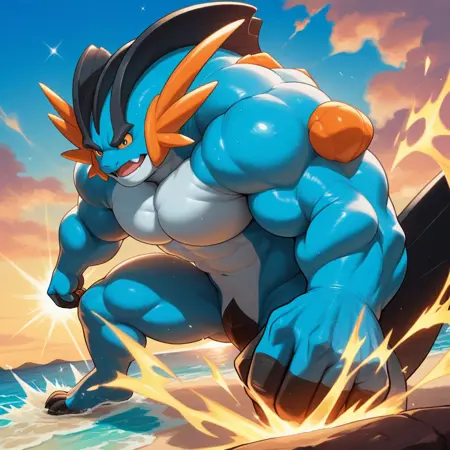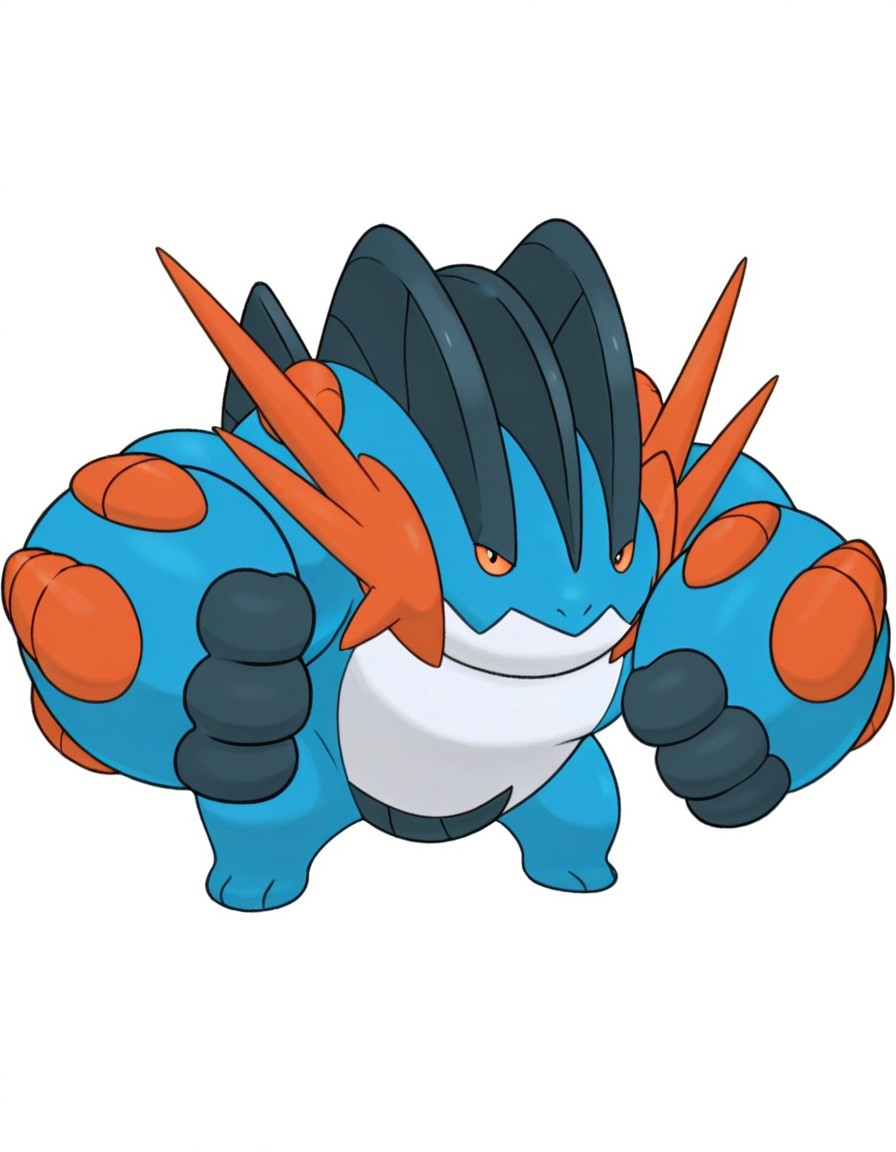 Sw4mp3rT, m3g4-forms, bulky, muscle, orange sclera, blue skin, black fins, white stomach, orange spiky cheeks, black fingers