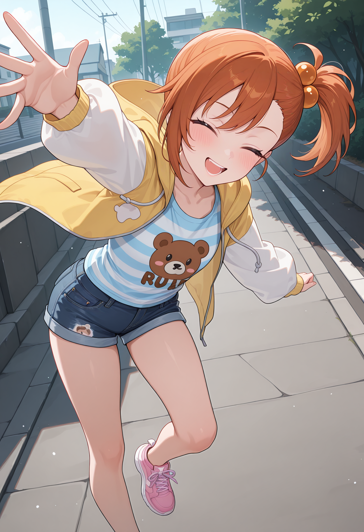 hair bobbles, hooded jacket, yellow jacket, open jacket, white sleeves, striped shirt, blue shirt, animal print, bear print, short shorts, denim, pink sneakers,