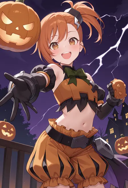 - pmisohal, lightning bolt hair ornament, orange crop top, black shirt, pumpkin costume, green bow, bare shoulders, midriff, detached sleeves, black sleeves, puffy short sleeves, elbow gloves, black gloves, gauntlets, black belt, jack-o-lantern, orange shorts, striped, puffy shorts, roller skates,