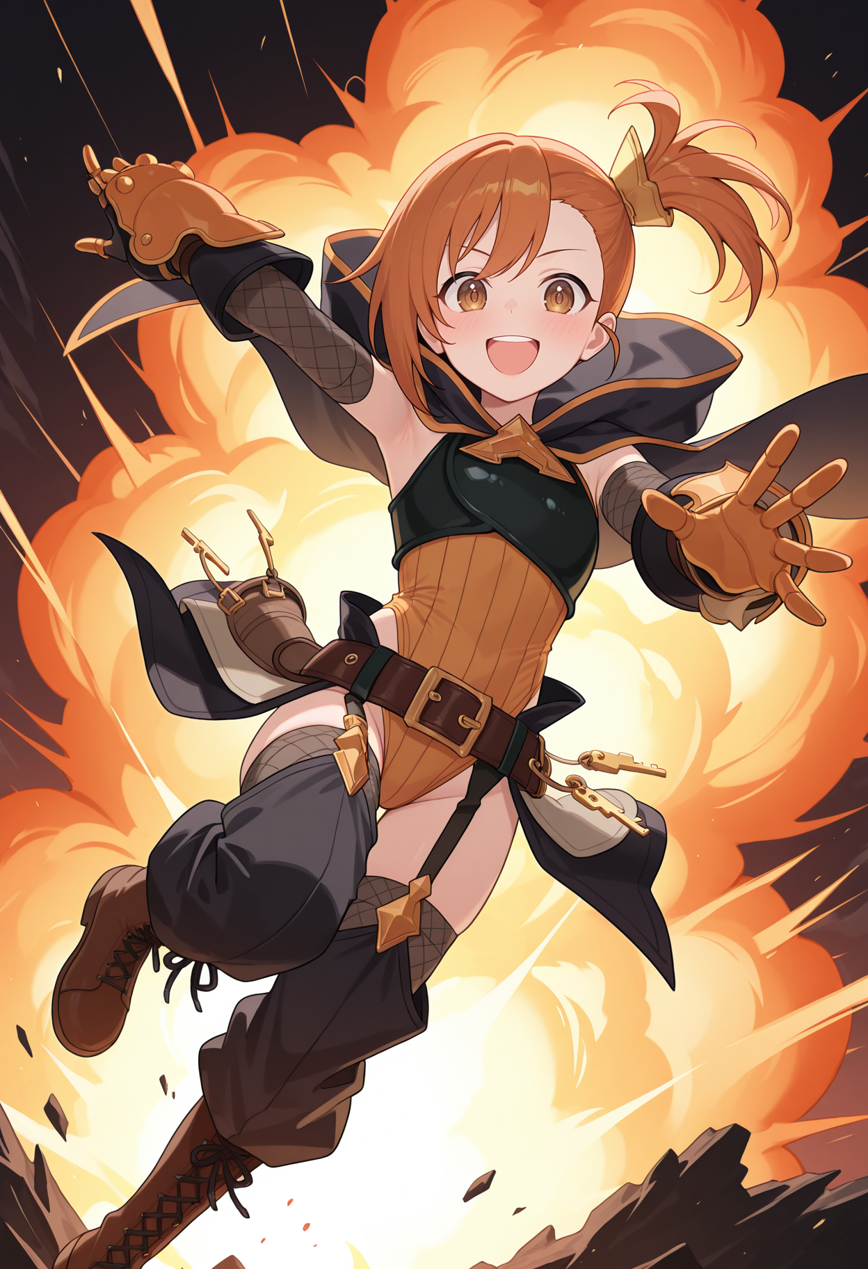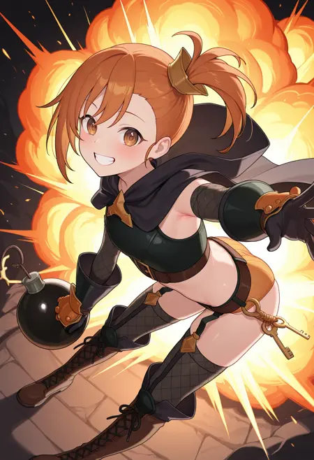 pmisodef, black cloak, hooded cloak, orange leotard, ribbed leotard, breastplate, two-tone leotard, fishnets, gloves, gauntlets, clothes around waist, belt, key, garter straps, black thighhighs, cross-laced footwear, boots,