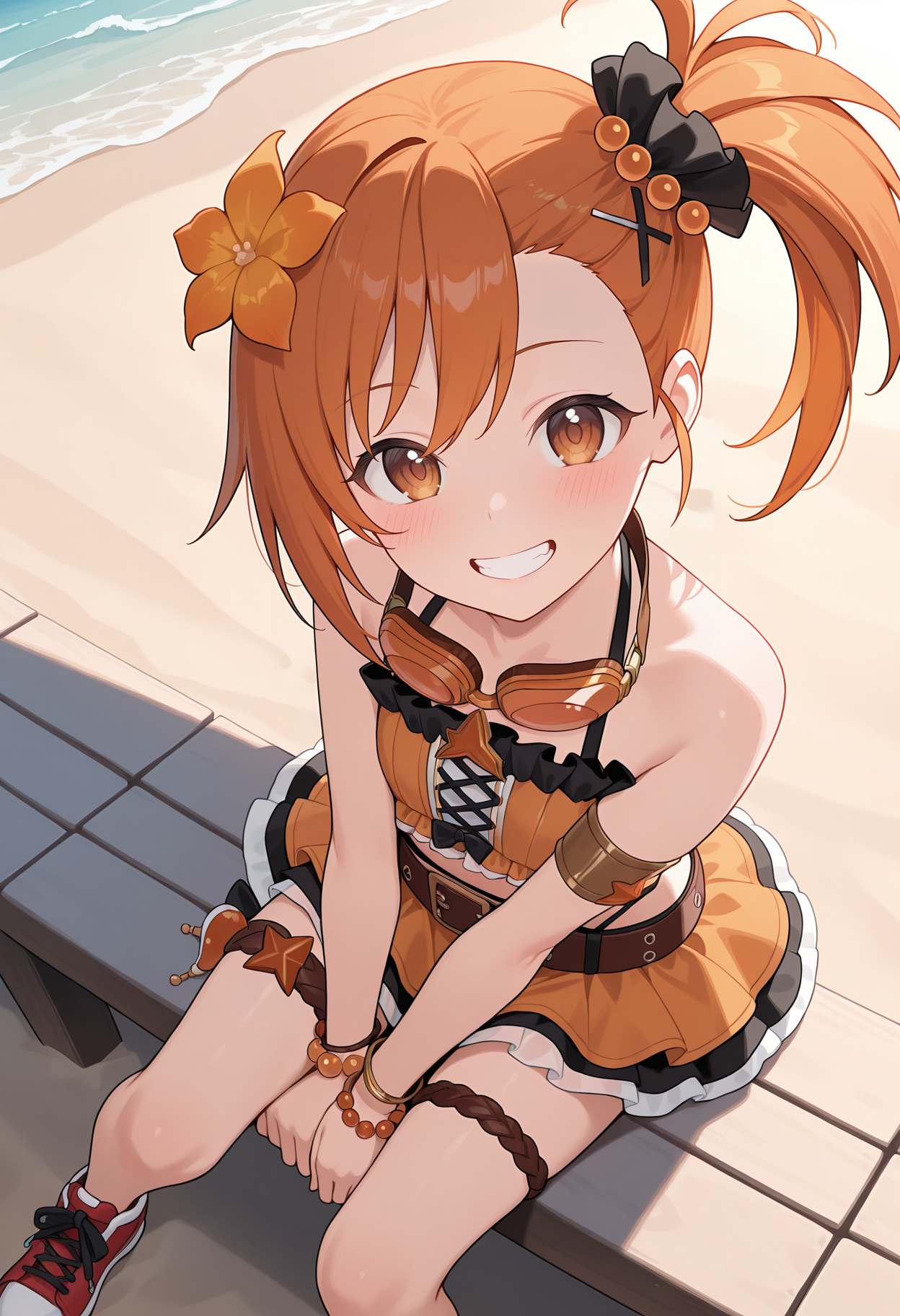 - pmisosum, hair flower, x hair ornament, googles around neck, frilled bikini, cross-laced bikini, orange bikini, black bow, bow bikini, goggles, beads, armlet, bracelet, belt, skirt, thigh strap, red sneakers,