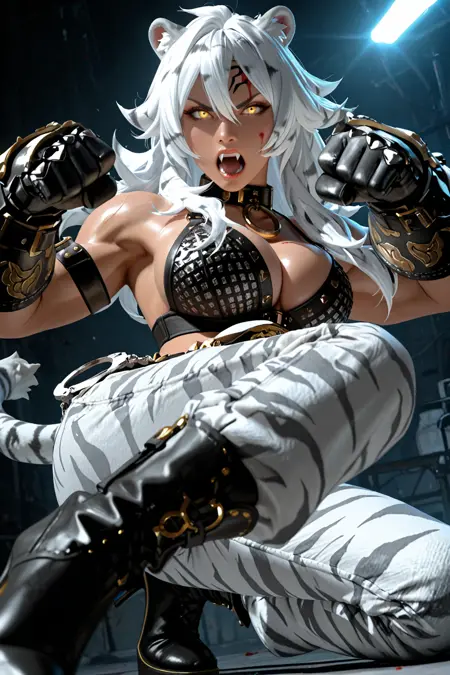触发词:LonXiao,虎女,肌肉,肌肉女性,二头肌,腹肌,深色皮肤女性,长发,白发,头发遮住眼睛,白色老虎斑纹,老虎内脏,多色头发,虎耳,额头上黑色印记,黄眼睛,獠牙,项圈,O型环,带钉文胸,黑色文胸,吊带装,乳沟,臂环,腰带,腰扣,臀部手铐,护腕,超大手套,裤子,白色老虎尾巴,高跟靴
