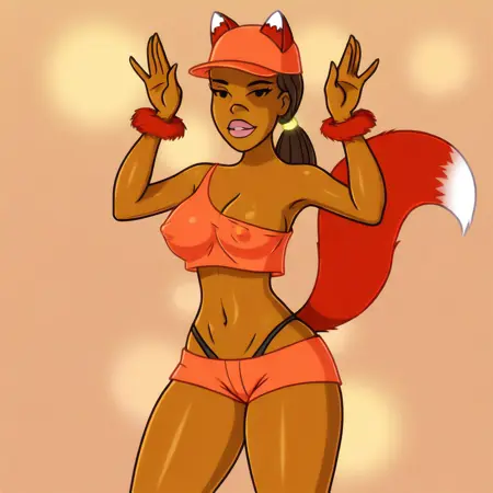 FoxxyLoveDT, 1소녀, 솔로, 검은 피부, 검은 피부를 가진 여자, 갈색 머리, 긴 머리, 낮은 토끼 꼬리, 검은 눈, 두꺼운 입술, 여우 귀가 달린 주황색 모자, 큰 가슴, 짧은 주황색 어깨 노출 상의, 젖가슴, 배꼽, 복부, 생식기, 검은 티엉, 주황색 짧은 반바지, 두꺼운 허벅지, 하이힐, 무릎 길이의 주황색 부츠, 털이 많은 여우 꼬리, 주황색 털 팔찌, 모래시계 체형, 노랑색 머리끈, 가려진 젖꼭지