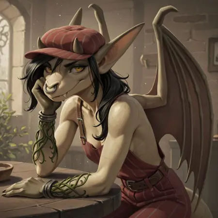 ivy_(deadlock), deadlock, gargoyle, nose_piercing, anthro, wings, nose_ring, ring_piercing, horn, black_hair, grey body, trousers, hat