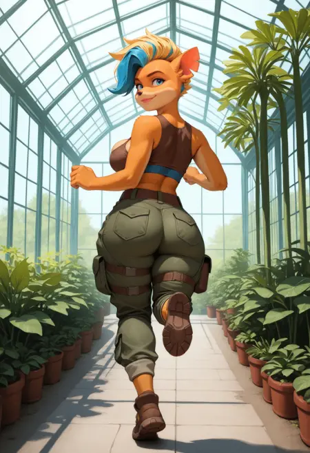 (ポジティブプロンプト) tawana, tawana bandicoot, multicolored hair, blonde hair, blue hair, mohawk, blue eyes, furry female, eyeliner, animal ears, large breasts,