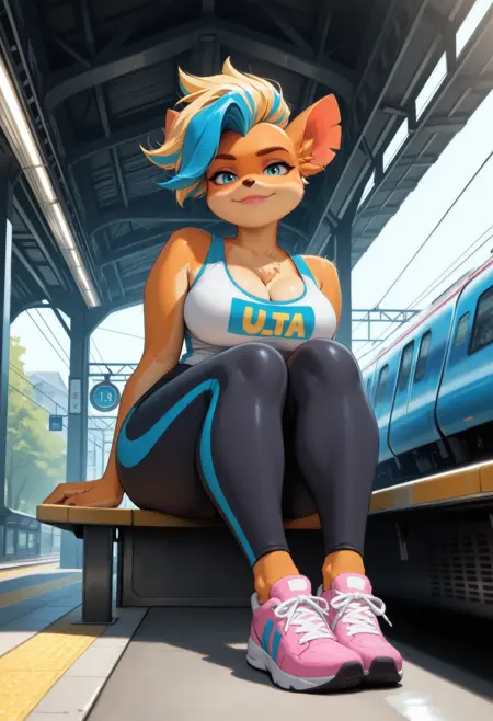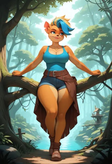(Positive Prompts) tawana, tawana bandicoot, multicolored hair, blonde hair, blue hair, mohawk, blue eyes, furry female, eyeliner, animal ears, large breasts,