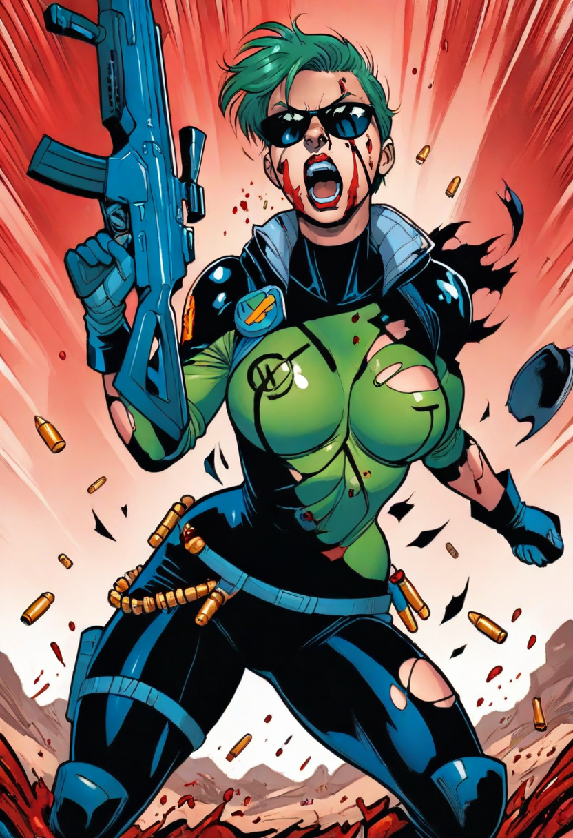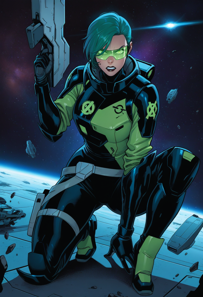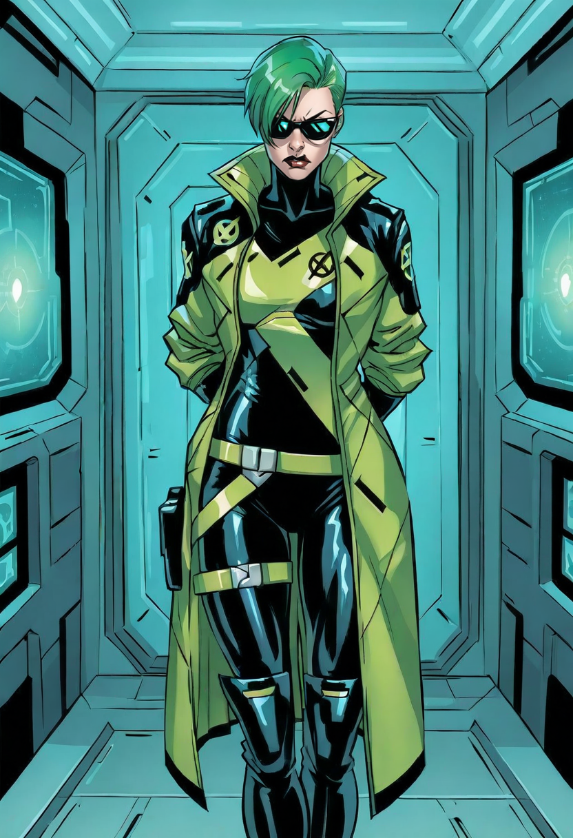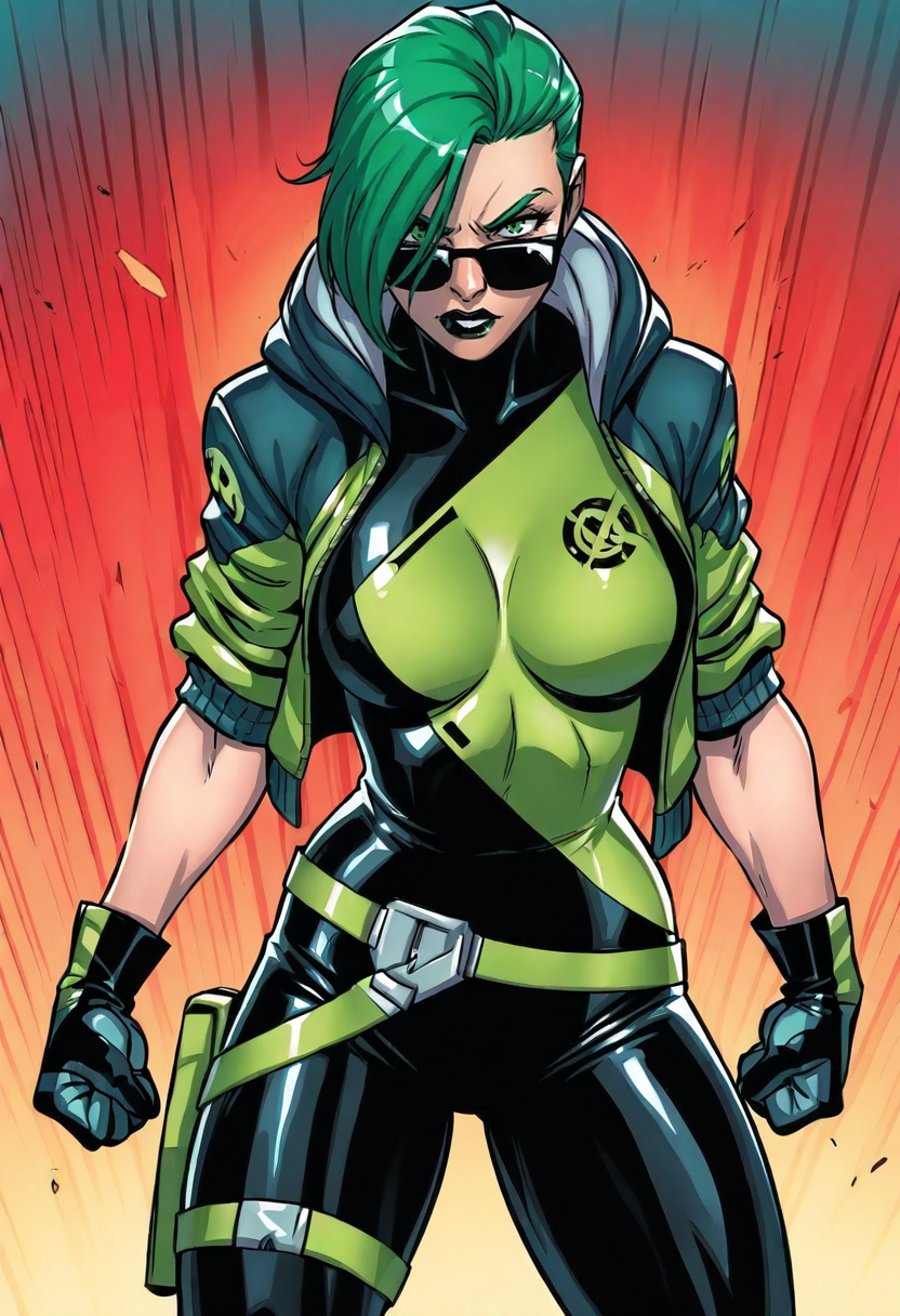 green hair,{green eyes|sunglasses},bodysuit,gloves.Positive prompt: