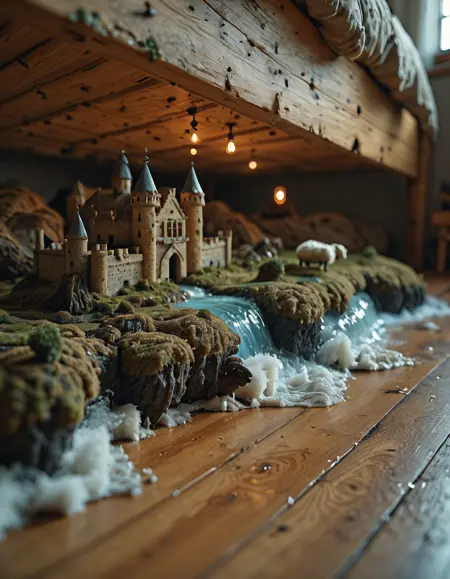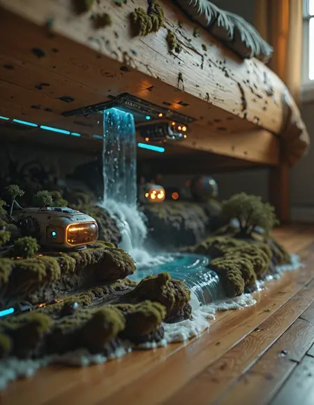 in a bedroom, microscopic illuminated cyberpunk city with vegetation and streets on the wooden floor under a wooden bed, from side, closeup, bokeh, T10, landscape, moss, waterfall, sunset, blue, orange, yellow, brown,