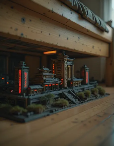 microscopic illuminated cyberpunk city with vegetation and streets on the wooden floor under a wooden bed, from side, closeup, bokeh, asian temple
