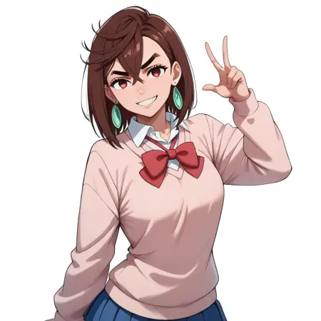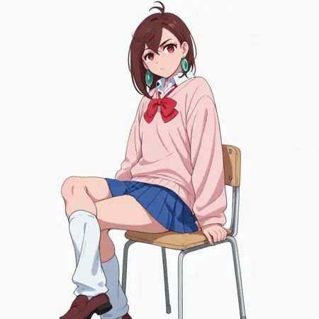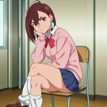 momoxd, 1girl, solo, school uniform, brown hair, skirt, earrings, jewelry, brown eyes, hand on hip, loose socks, socks, shoes, sweater, bow, short hair