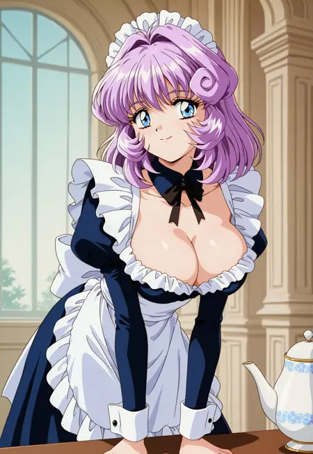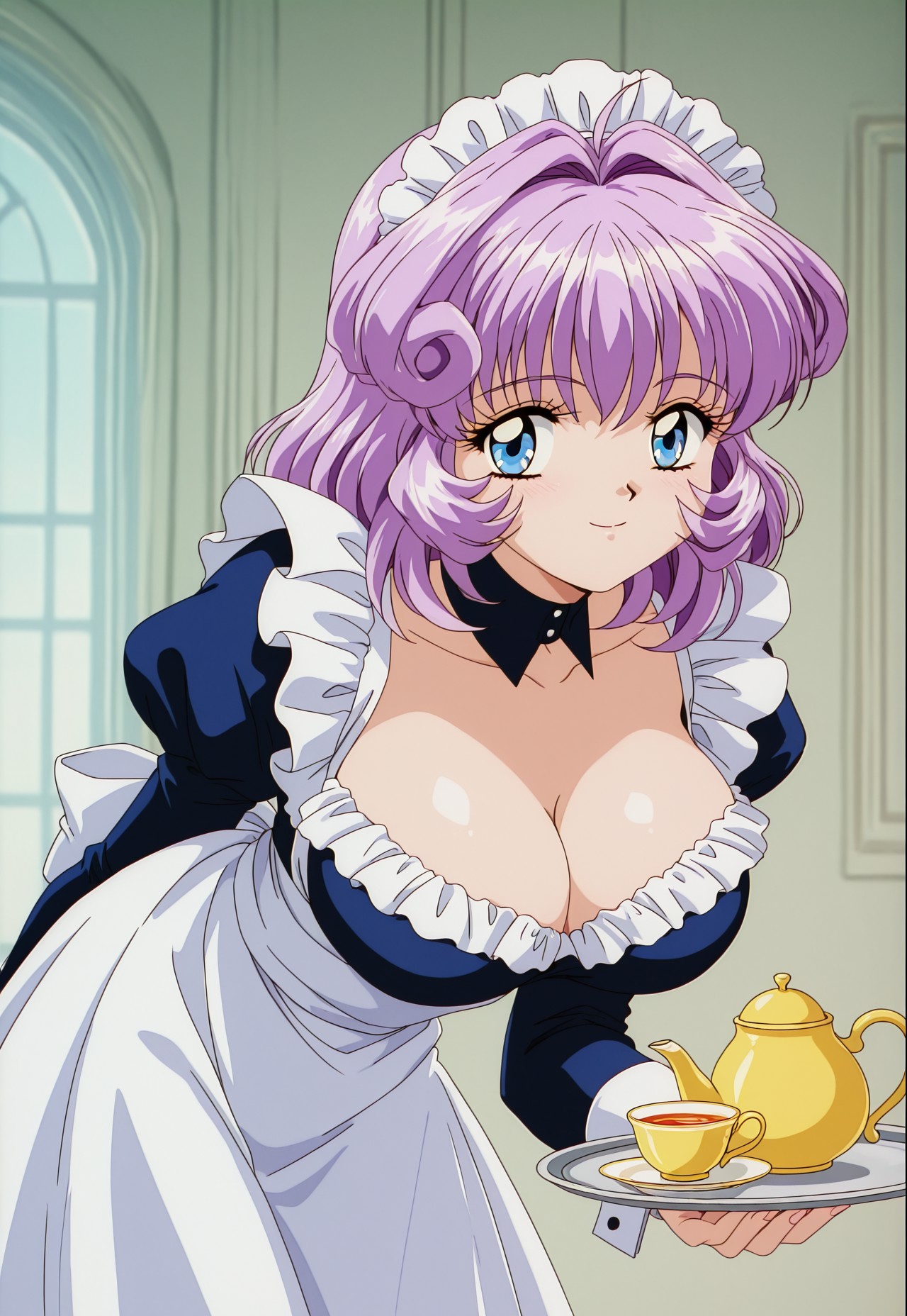Trigger words and reccomended prompts: RINAYUIL, 1girl, purple hair, curly hair, blue eyes, large breasts, retro artstyle,