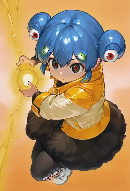 kerchanlu、カラー、アニメスタイル、青い髪、目の間の髪、短い髪、二つの塊髪、塊髪、髪飾り、カエルの髪飾り、塊髪に目がついている、大きな目、