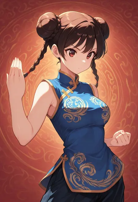 pai1, 1girl, solo, sleeveless chinese clothes, double bun, twin braids, hair bun, martial arts beltss, pants, sleeveless, realistic, 3d