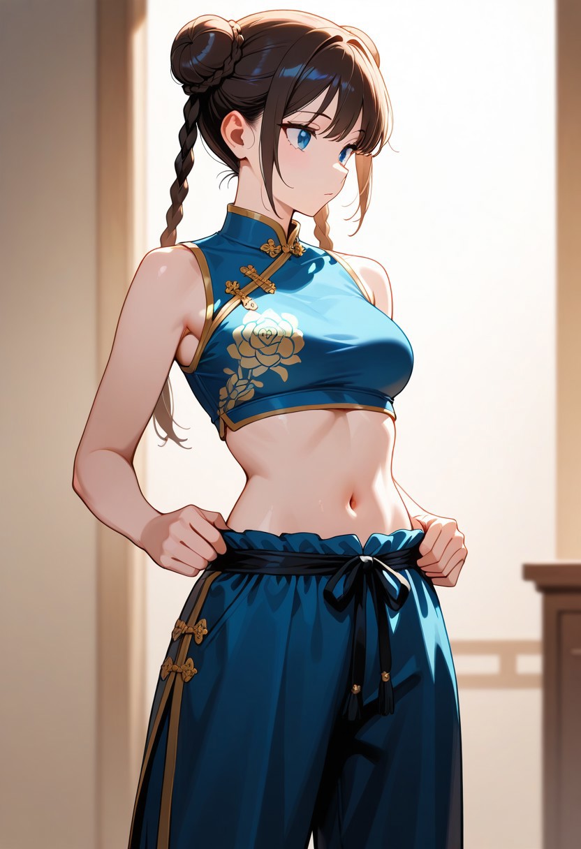 midriff chinese clothes, pai2, sleeveless midriff, hair bun, navel, double bun, 3d, twin braids, pants, crop top