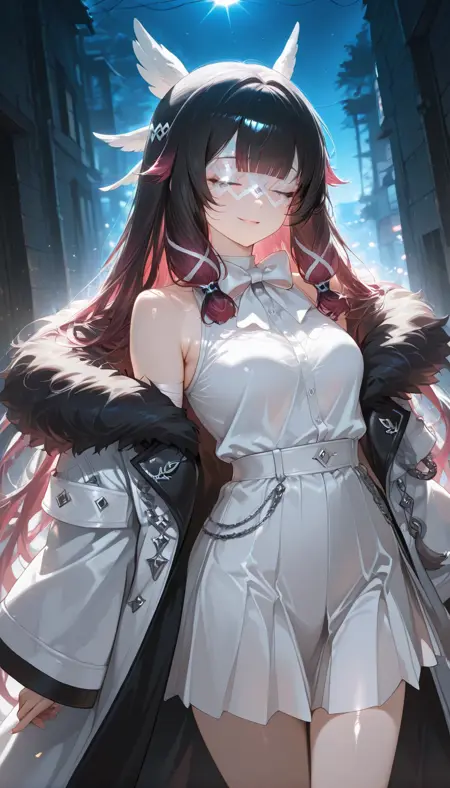 long sleeves, bow, ribbon, bare shoulders, jacket, sleeveless, bowtie, off shoulder, coat, fur trim, white bow, white coat, fur-trimmed coat, white bowtie, shirt, sleeveless shirt, armpit crease, wrist bow, coat on shoulders, aiguillette, pleated skirt, bare legs, bandages, white shirt, white skirt, open coat, long coat, two-tone coat, wide sleeves, black fur trim, overfit coat,Close Coat