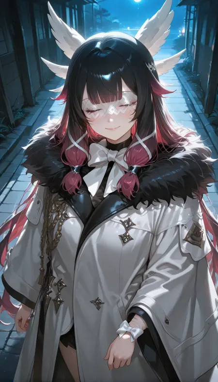 bow, ribbon, jacket, bowtie, coat, fur trim, white bow, fur-trimmed coat, white bowtie, aiguillette, white coat, long coat, two-tone coat, wide sleeves, bandages, wrist bow, black fur trim, overfit coat, close coat,Angel