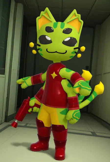 Tags (New): Gnarpyredesign, furry, male, furry male, alien, feline, cat, two tails, dipstick tails, whiskers, four arms, four eyes, four ears, yellow inner-ears, Green fur, yellow fur, multicolored fur, yellow pawpads, noseless, no nose, red armor, sleeveless, red armbands, red boots, :3
