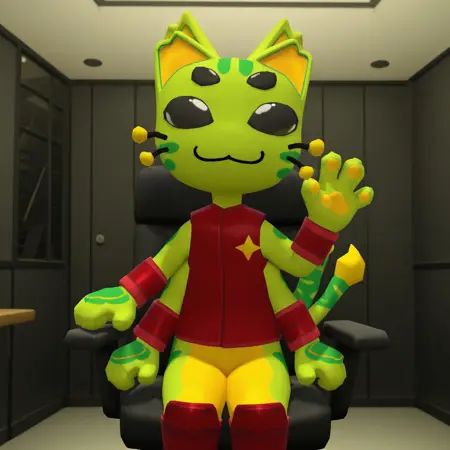 Tags (Old): furry, male, furry male, antennae, animal ears, cat ears, yellow inner-ears, Green fur, fur tufts, feline, cat, yellow star on torso, tail, dipstick tail, :3, eyes closed, yellow pawpads, noseless, no nose,