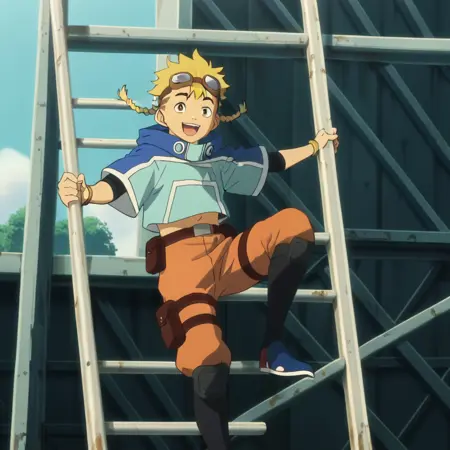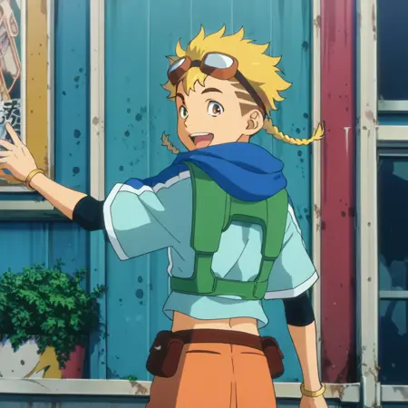 Outfit 1: male, multicolored hair, two-tone hair, blonde hair, brown hair, twin braids, brown eyes, chestnut eyes, goggles, goggles on head, hooded jacket, black undershirt, green backpack, bracelets, jewelry, utility belt, orange pants, leg pouches, knee pads, black socks, shoes