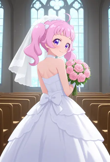 Prompts: himaripri, pink hair, ahoge, purple eyes, twintails,