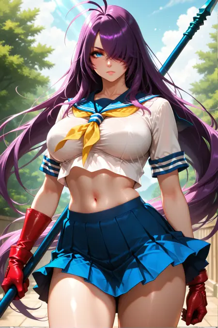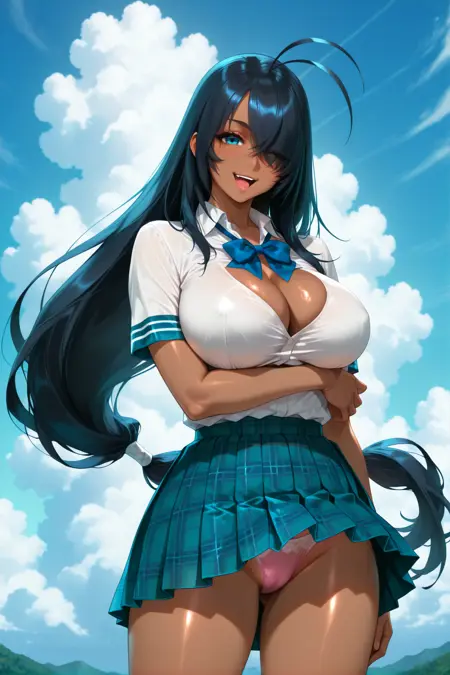 ilunchoukan-u, 1girl, breasts, nipples, dark skin, penis, hetero, 1boy, sex, underwear, panties, skirt, purple hair, long hair, large breasts, testicles, school uniform, blue skirt, black panties, serafuku, hair over one eye, neckerchief, antenna hair, sweat, vaginal, uncensored, red neckerchief, short sleeves, from below, dark-skinned male, clothes lift, clothing aside, dark-skinned female, solo focus, blue eyes, panties aside, shirt, parted lips, pleated skirt, smile, white shirt, sailor collar, blue sailor collar, looking at viewer, thighs, wet, standing, interracial<lora:illustrious Unchou Kan-u 768x1152:1>