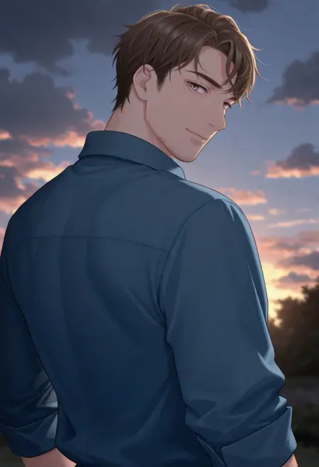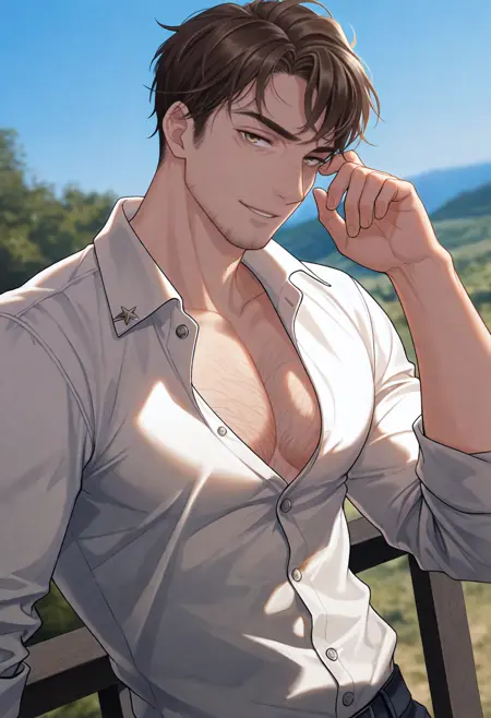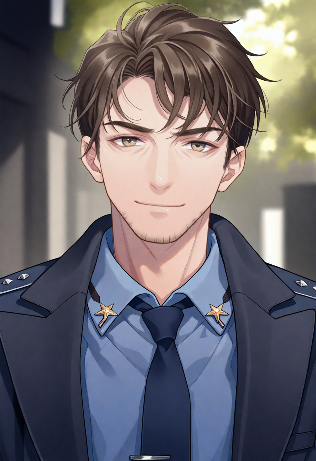 d4r1u5m,brown hair,short hair,yellow eyes,facial hair,stubble
