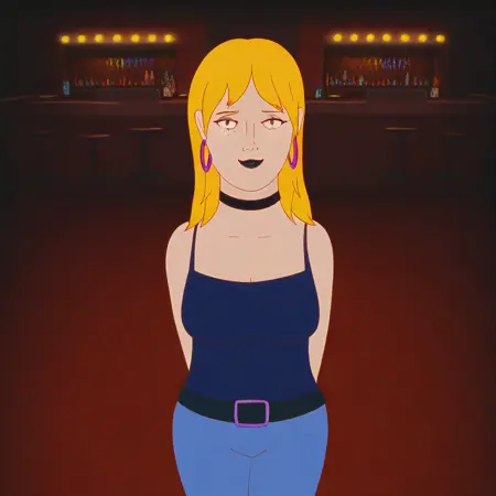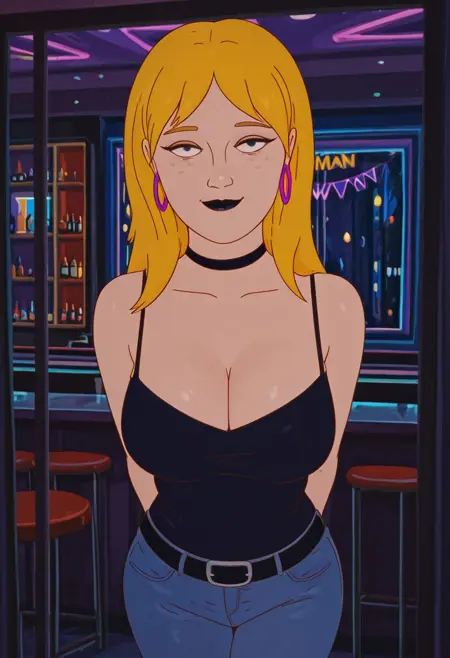 1. ((makeup, black lips, purple hoop earrings, black choker necklace, sexy black camisole, obscene cleavage, huge cleavage, denim trousers with black belt, black shoes, black nails, ))