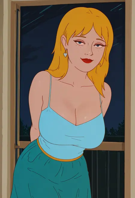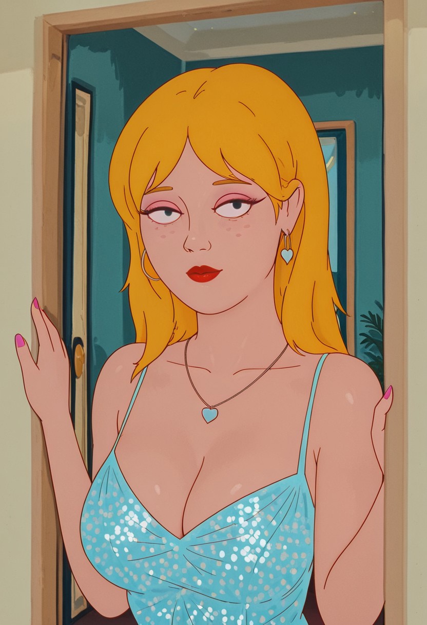 2. ((makeup, red lips, silver earring with heart pendant, sexy light blue camisole, obscene cleavage, huge cleavage, short green skirt, green nails, ))