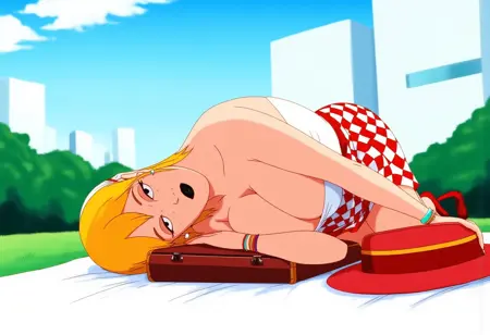 3. ((green bra, blue bed sheet wrapped around her body, green nails, ))