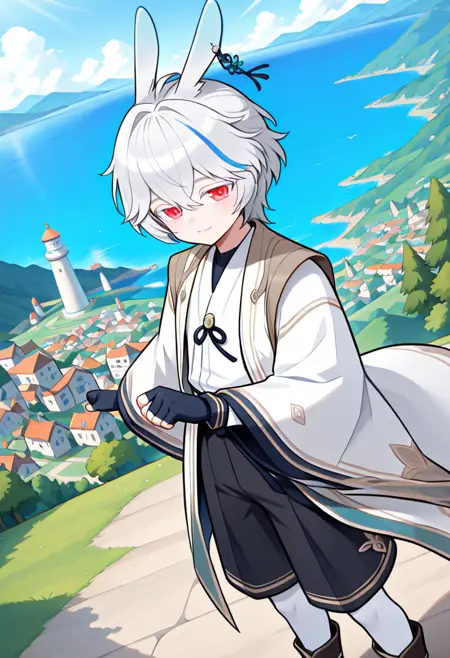 len_male,1boy,solo,짧은 머리,다색 머리,흰 머리,회색 머리,스트라이프 머리,앞머리,눈 사이 머리,색깔 있는 속눈썹,붉은 눈,토끼 귀,헤어 장식,흰 킬리모,하오리,긴 소매,넓은 소매,손가락 없는 장갑,검은 바지,흰 허벅지 양말,부츠,