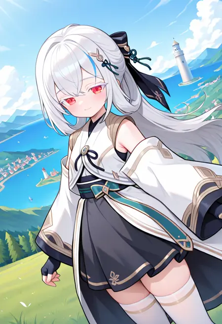 헤어 장식, 헤어 리본, 흰 킬리모, 하오리, 어깨 노출, 긴 소매, 넓은 소매, 손가락 없는 장갑, (검은 스커트:0.8), 흰 허벅지 양말, 부츠,