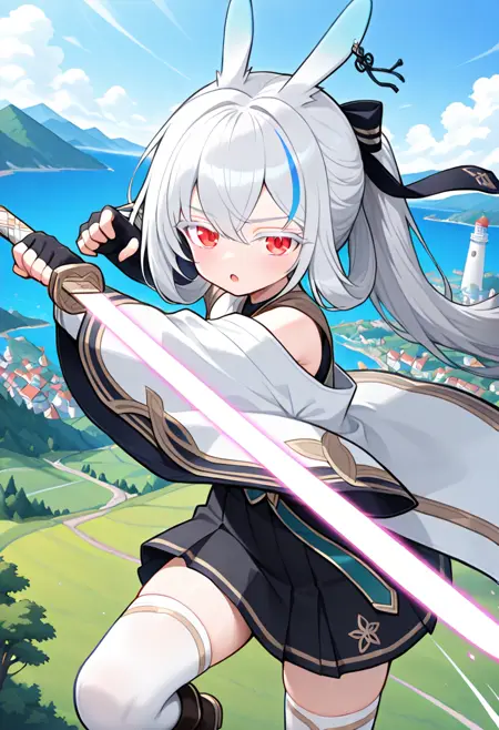 len_female,1girl,solo,긴 머리,다색 머리,흰 머리,회색 머리,플랫테일,스트라이프 머리,앞머리,눈 사이 머리,색깔 있는 속눈썹,붉은 눈,토끼 귀,헤어 장식,헤어 리본,흰 킬리모,하오리,어깨 노출,긴 소매,넓은 소매,손가락 없는 장갑,(검은 스커트:0.8),흰 허벅지 양말,부츠,