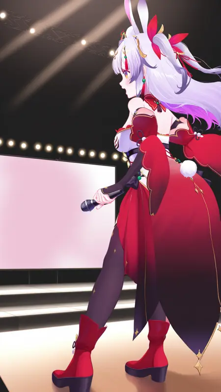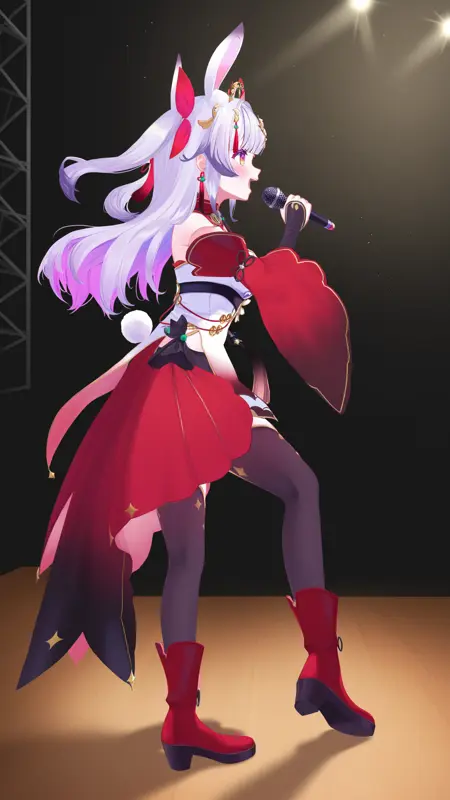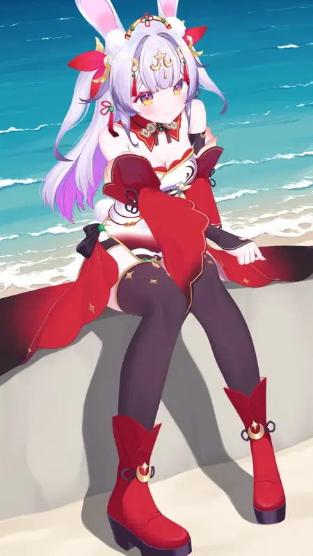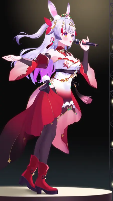 推荐使用 (lanyin reine,bnj dress:1.05),bangs,bare shoulders,black fingerless elbow gloves,black thighhighs,breasts,detached collar,detached sleeves,dress,gradient eyes,gradient hair,hair ornament,hair ribbon,jewelry,light purple hair,long hair,nail polish,pink nails,rabbit ears,rabbit tail,red boots,red nails,ribbon,streaked hair,tassel,tiara,two side up,two-tone eyes,virtual youtuber,two-tone dress,china dress,