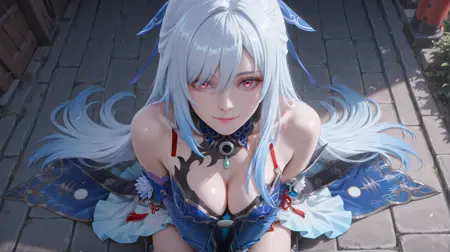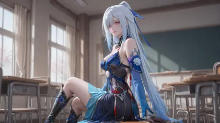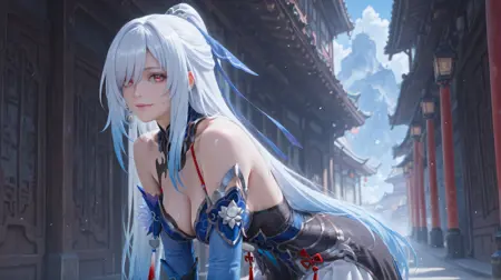 Jingliu,jingliu \(Honkai: Star Rail\),1girl,solo,blue sleeves,long hair,detached sleeves,red eyes,gloves,white hair,bare shoulders,high ponytail,dress,black gloves,boots,black footwear,tachi-e,very long hair,high-low skirt,blue dress,