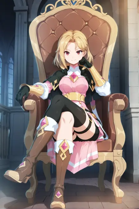 medium hair, blonde hair, red eyes, peach pink dress, short dress, black shorts, medium breasts, bracer, gloves, black capelet, thigh strap, single thighhighs, brown boots, knee boots