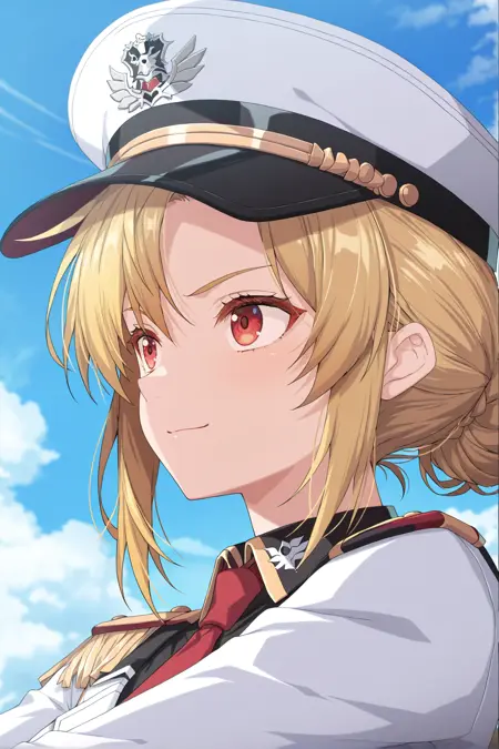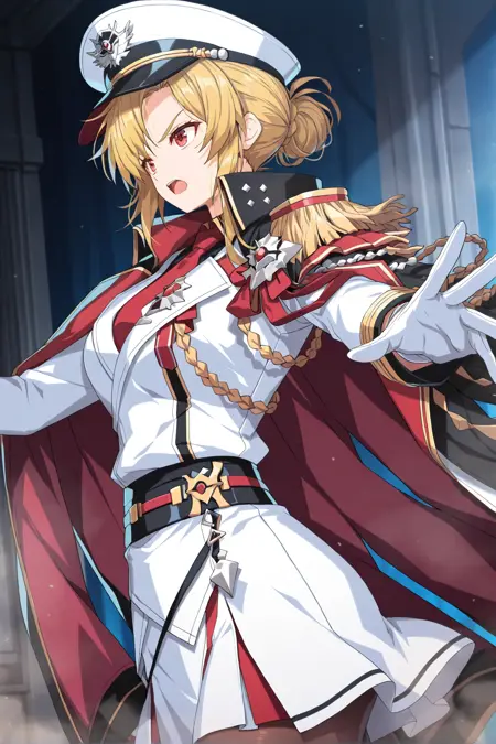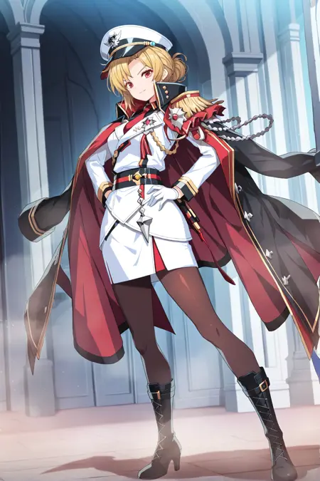 red eyes, blonde hair, hair bun on back, red necktie, white military hat, white military dress, epaulette, aiguillette, long sleeves, white gloves, white skirt, pantyhose, knee high heel boots