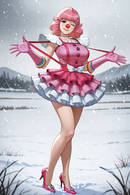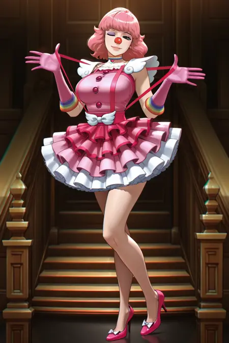 Geiru Toneido, short hair, pink hair, brown eyes, black eyes, large breasts, choker, elbow gloves, high heels, sleeveless dress, buttons, makeup, short dress, frilled dress, white bow, frilled skirt, pink dress, multicolored clothes, pink lips, pink footwear, layered skirt, pink gloves, shoulder pads, rainbow, pumps, clown