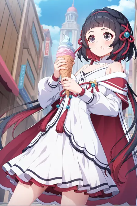 one piece dress, white dress, long sleeves, hair ornament, light bronze eyes, long hair, black hair, inner red hair, two-tone hair, blunt bangs, bare shoulders, short hair, low twintails, flat chest, low heel shoes