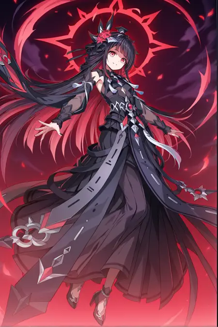 red eyes, black hair, inner red hair, long hair, hair ornament, flat chest, black long dress, detached sleeves, see-through sleeves, black bracers, black nails, black high heels
