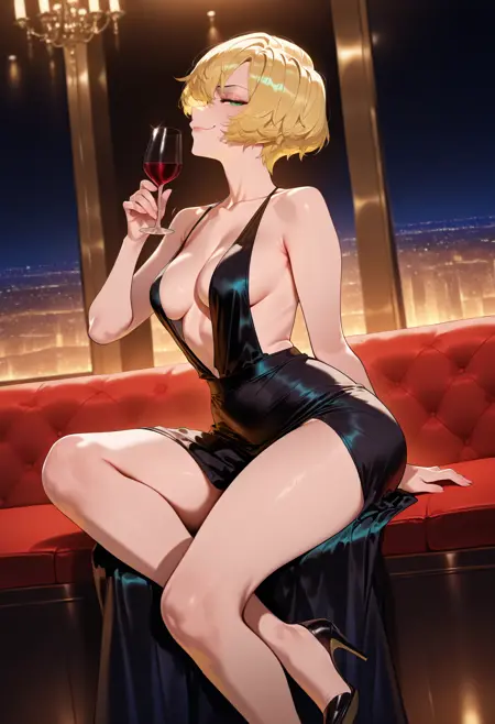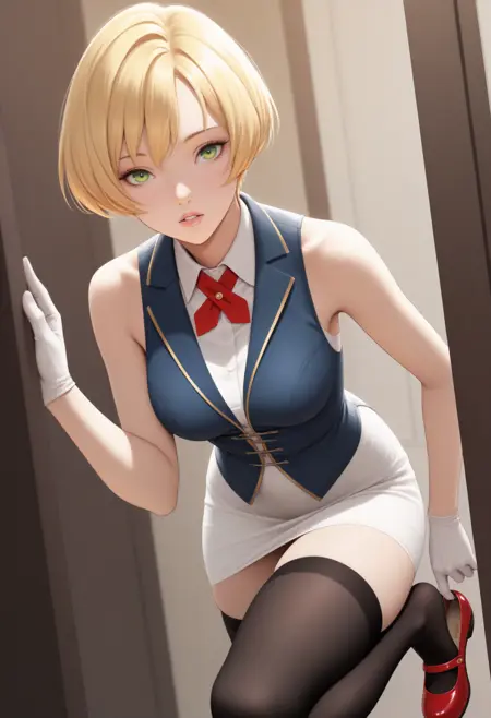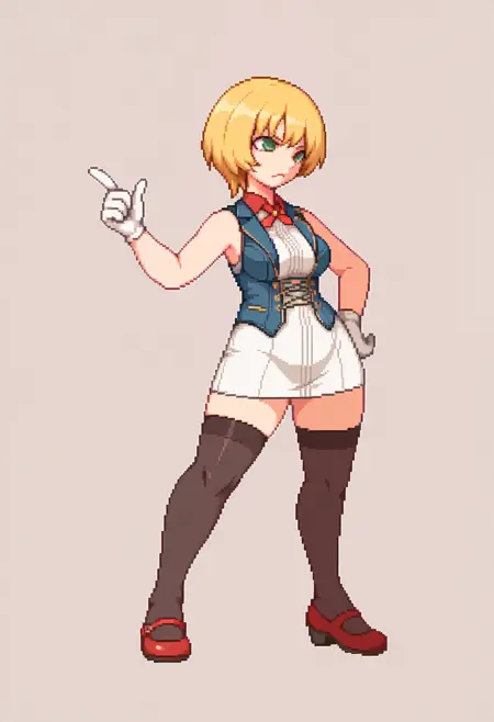 默认外观: fr4n,金发,短发,绿眼,蓝色背心,有领连衣裙,红色颈带,中等胸部,无袖,白色手套,白色连衣裙,铅笔裙,黑色过膝袜,玛丽珍鞋,红色鞋履