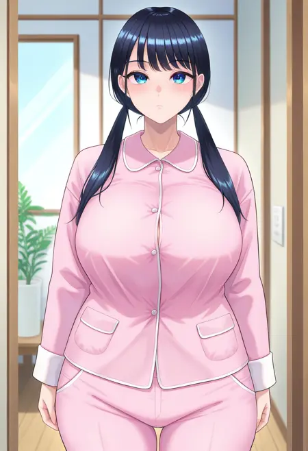 miuww, blue eyes, black hair, long hair, bangs, large breasts,