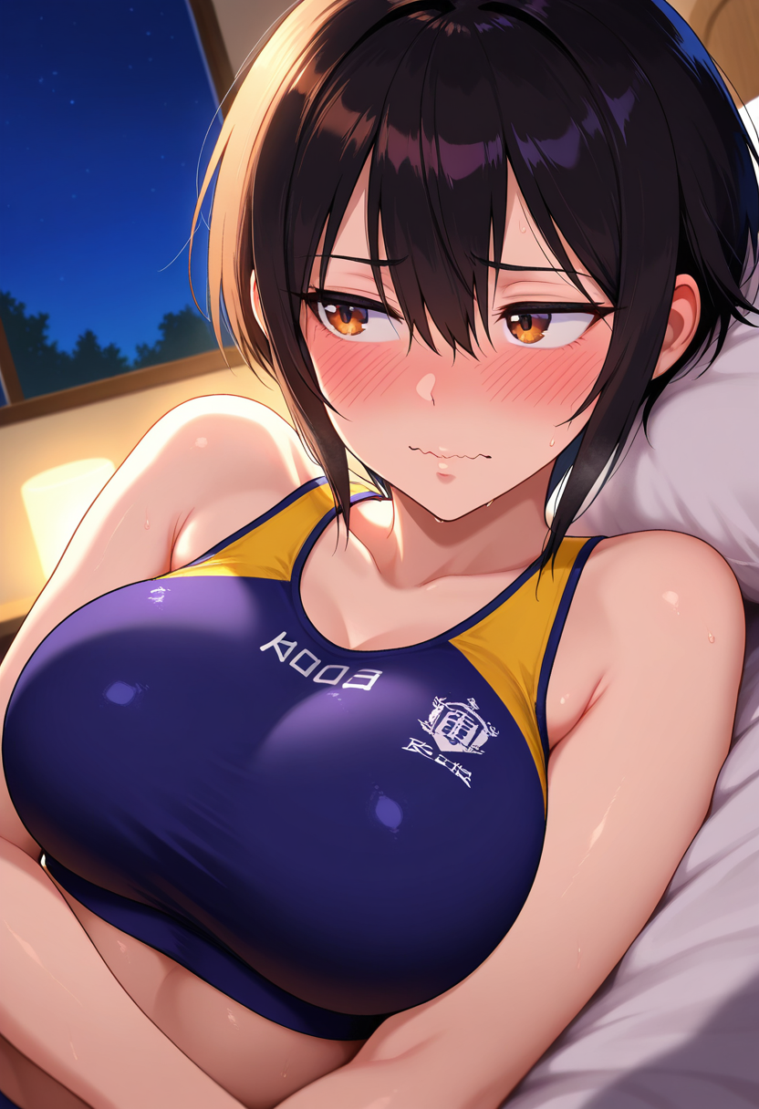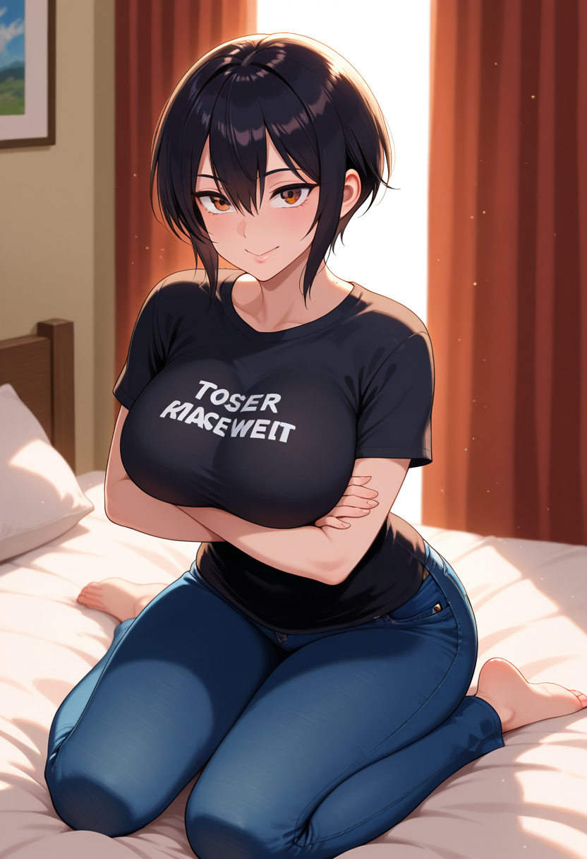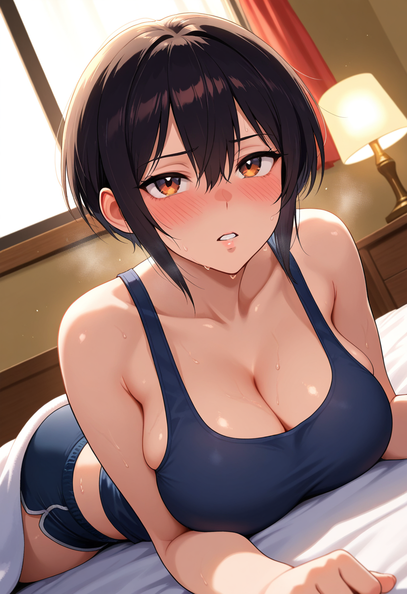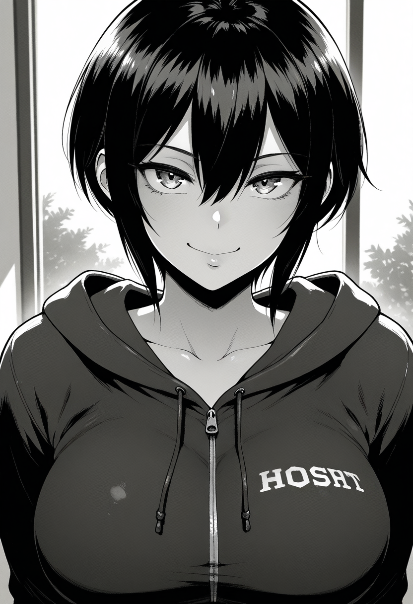 - hoshiharaww, tomboy, brown eyes, black hair, short hair, hair between eyes, sidelocks, large breasts,