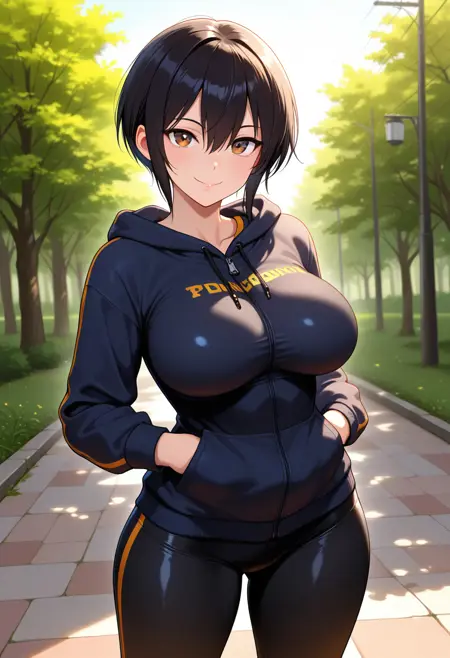 - skin tight, impossible clothes, hoodie, hood, hood down, long sleeves, leggings, sneakers,