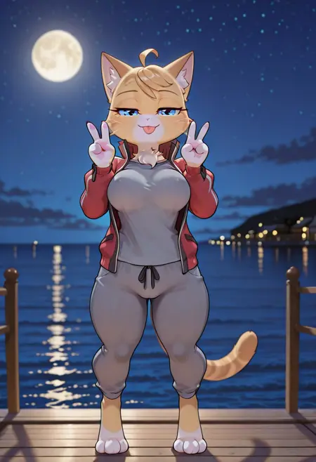 프롬프트: yellow fur,blue eye,ahoge,furry,,red jacket,grey shirt, open jacket,long sleeves,track jacket, grey pants