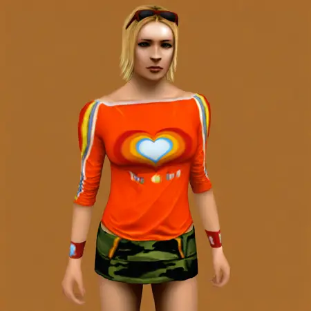 - 주황색 셔츠, 하트 무늬, 녹색 캠플라그 미니스커트, 선글라스, 머리에 안경, 팔찌, 부츠,