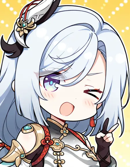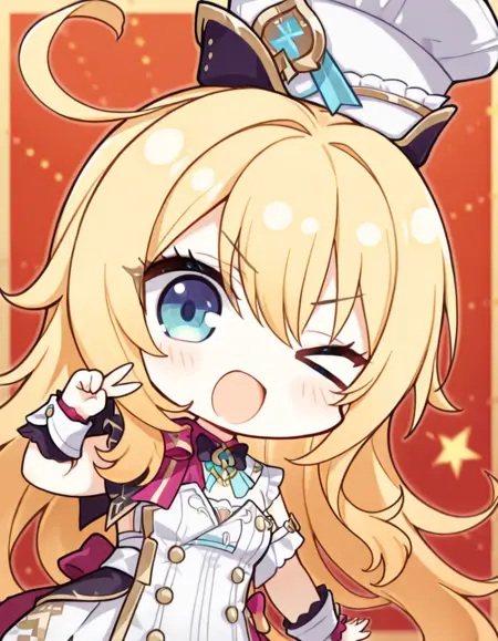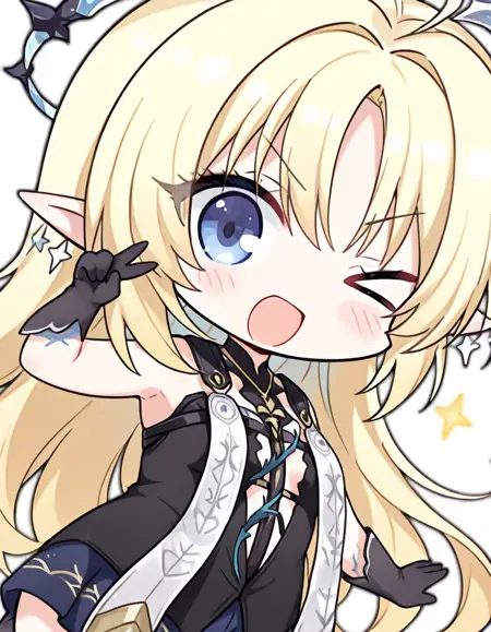 ciallo~\(∠・ω< \)⌒☆, 1girl, solo, one eye closed, chibi, >_o, v, open mouth, looking at viewer, smile, hand up, ;d, blush, v-shaped eyebrows, sidelocks