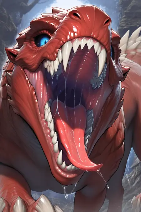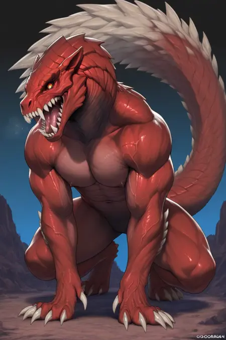 Odogaron, scales, claws, fangs, tail, glowing red eyes