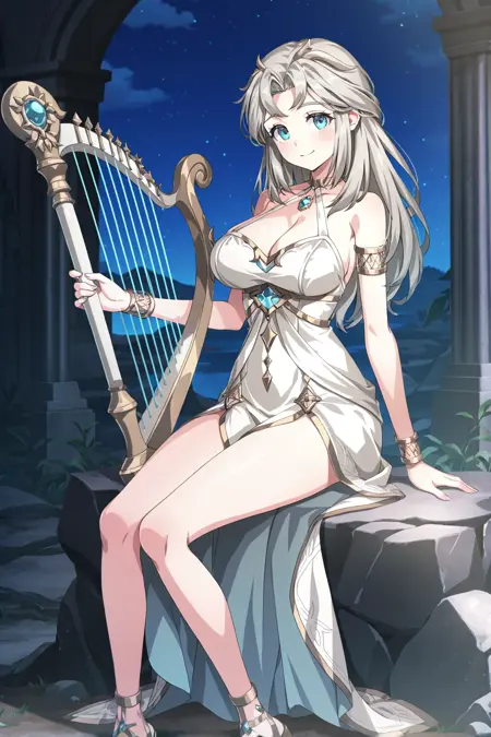 cyan eyes, white dress, bangs, platinum grey hair, long hair, bare shoulder, jewelry, thigh, big breasts, cleavage, sandals